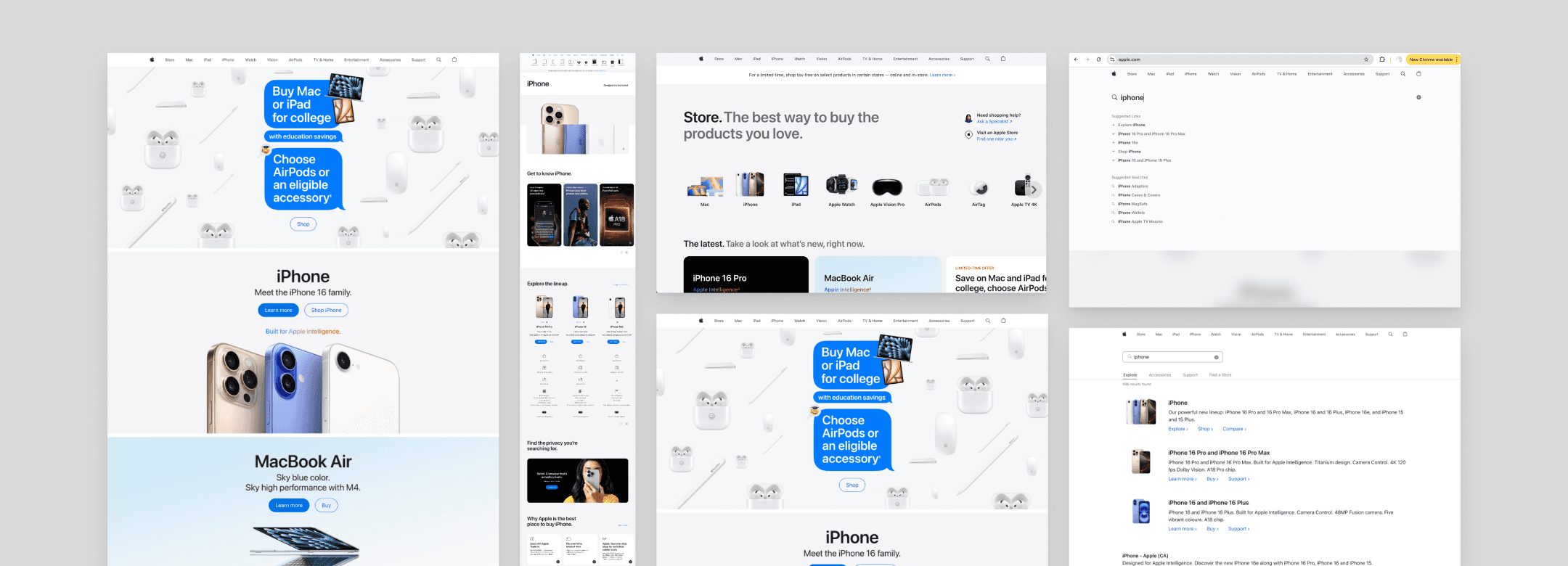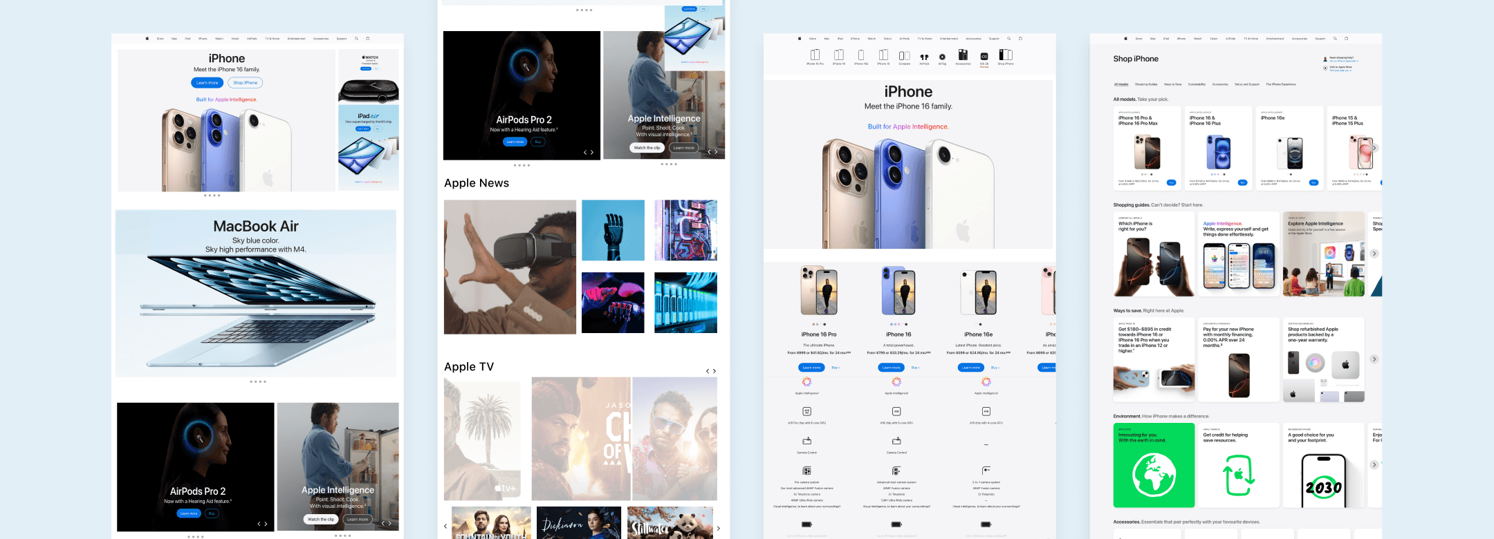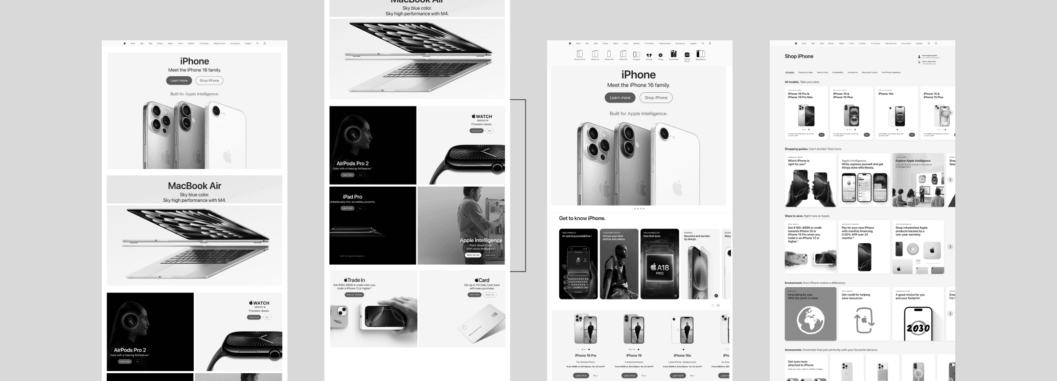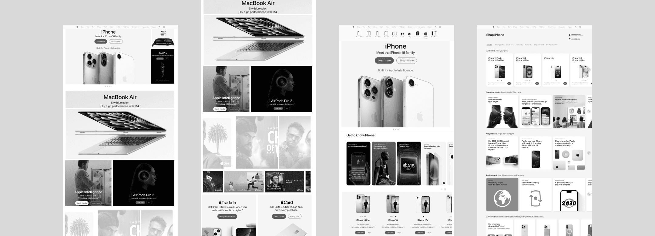 This review of apple.com highlights a highly polished, brand-led experience that leads with visual design, storytelling, and emotional engagement, for example: the high-quality imagery, consistent typography, and scroll-based narratives reinforce Apple’s premium positioning and encourage exploration.